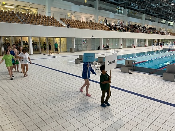 7:30 Uhr haben wir ein sehr vielfältiges Frühstück gegessen. Es gab Käse, Sülze, Wurst, Salami, Hack, Datteln und Joghurt. Der Kakao stand auch schon auf dem Tisch für uns bereit. 9:30 Uhr wurden wir mit den Schulbussen der Carl-Von-Linné Schule zur Schwimmhalle gefahren. Nach dem Umziehen ging es in die Halle zum Einschwimmen. 10:30 Uhr fand der Einmarsch der Schulen in die Halle statt. Wir haben alle eine schöne Lunchbox bekommen. Gegen 10:45 Uhr begannen die Wettkämpfe, Nike und Samira waren gleich zu Anfang am Start. Wir haben bei Freistil, Brust und Rücken mitgemacht. Nike ist am meisten geschwommen, nämlich Freistil, Rücken und Brust. Riccardo war bei Freistil und Brust am Start, Line bei Freistil, Samira bei Freistil und Rücken und Alexander bei Freistil und Brust. Am Ende fand wieder ein großes Staffelschwimmen statt. Dabei wurden alle Schwimmerinnen und Schwimmer in verschiedene Gruppen aufgeteilt und mussten im Paararbeit verschiedene Sachen transportieren. Die pinke Gruppe mit Riccardo hat gewonnen. Die Siegerehrung war ein bisschen durcheinander, aber wir wurden mit T-Shirts, Trinkflaschen und Medaillen belohnt. Nach dem Umziehen wurden wir von einem lustigen Busfahrer zur Schule zurück gefahren. Dort gab es dann gleich ein Buffet mit Getränken, Kuchen und Schnitten/Broten. Dabei konnten wir uns richtig stärken und ein wenig unterhalten. 17:00 Uhr kam uns ein Reisebus abholen, um uns zum Restaurant Roma zu fahren. Die Fahrt war ganz entspannt. Am Friedrichstadtpalast sind wir ausgestiegen und sind zum Restaurant gelaufen. Riccardo und Nike haben schon nach ein paar Sekunden ihre Pizza bekommen. Wahrscheinlich, weil sie so toll geschwommen sind. Alle anderen mussten noch etwas auf ihre Pizza warten, denn es war auch bestimmt eine Menge Arbeit für die Pizzabäcker und Kellner alle ca. Menschen zu versorgen. Wir hatten Pizza Magheritta, Salmone, Salami, Mista und Vegetaria. Am Ende mussten sich Frau Radzun und Herr Mühlinghaus sogar etwas beeilen, damit wir noch rechtzeitig zur großen Show „Arise“ kommen. Das hat aber super geklappt und wir sind über den Nebeneingang in den Friedrichstadtpalast reingegangen. Unsere Plätze waren auf dem Hochparkett und wir konnten die Bühne sehr gut sehen. In der Show gab es viel Musik und Tanz. Es gab auch Wasserfontänen und Feuer. Der Gesang war mal auf Englisch, mal auf Deutsch. Besonders toll waren Schaukelartisten und Trapez-Künstler. Auf der Busfahrt zurück wurden schon einige von uns sehr müde, darum war das Bett dann auch sehr nötig. Frau Radzun und Herr Mühlinghaus haben sich dann trotzdem noch mit anderen Lehrkräften und Begleitungen der anderen Schulen locker unterhalten.