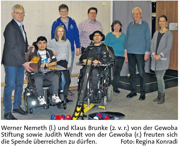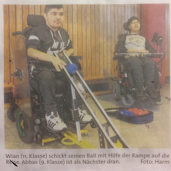 Das 2019 durch die Gewoba Stiftung geförderte Indoor-Boccia Projekt der Paul-Goldschmidt-Schule stand zur Abstimmung zum „Projekt des Jahres“. Die Gewoba kam mit 1300€ für eine professionelle Ausstattung mit Bällen und Abroll-Hilfe auf. Die Schüler Abbass und Wian wurden für einen Fototermin zum Spielen ausgewählt.